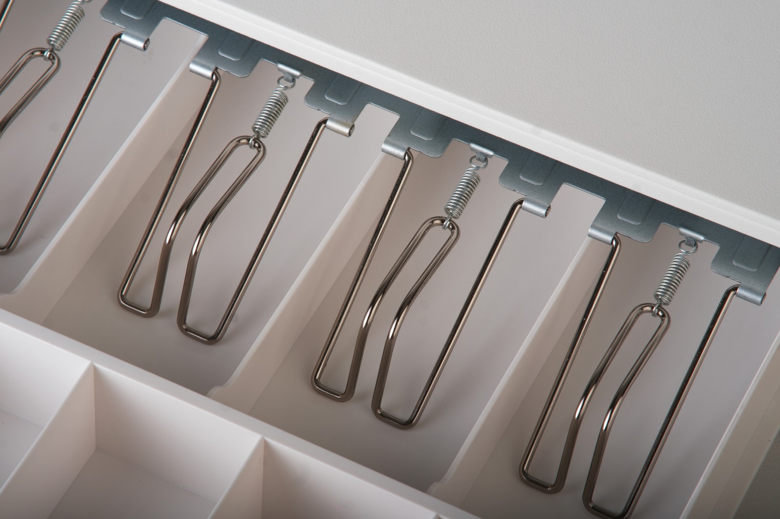 Внутренний лоток для денег имеет 4 отделения для купюр с металлическими держателями и 5 отделениями для монет.